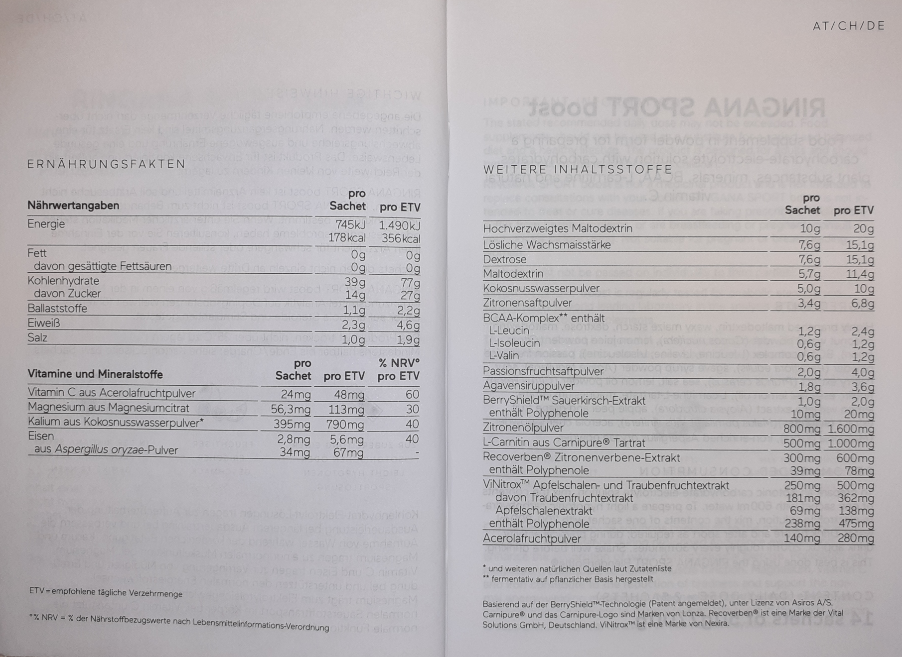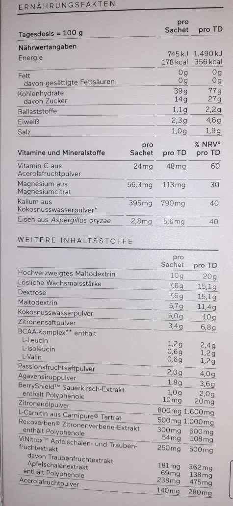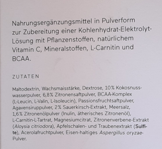 Nahrungsergänzungsmittel in Pulverform zur Zubereitung einer Kohlenhydrat-Elektrolyt-Lösung mit Kohlenhydraten, Pflanzenstoffen, Mineralstoffen, BCAA, L-Carnitin und natürlichem Vitamin C.