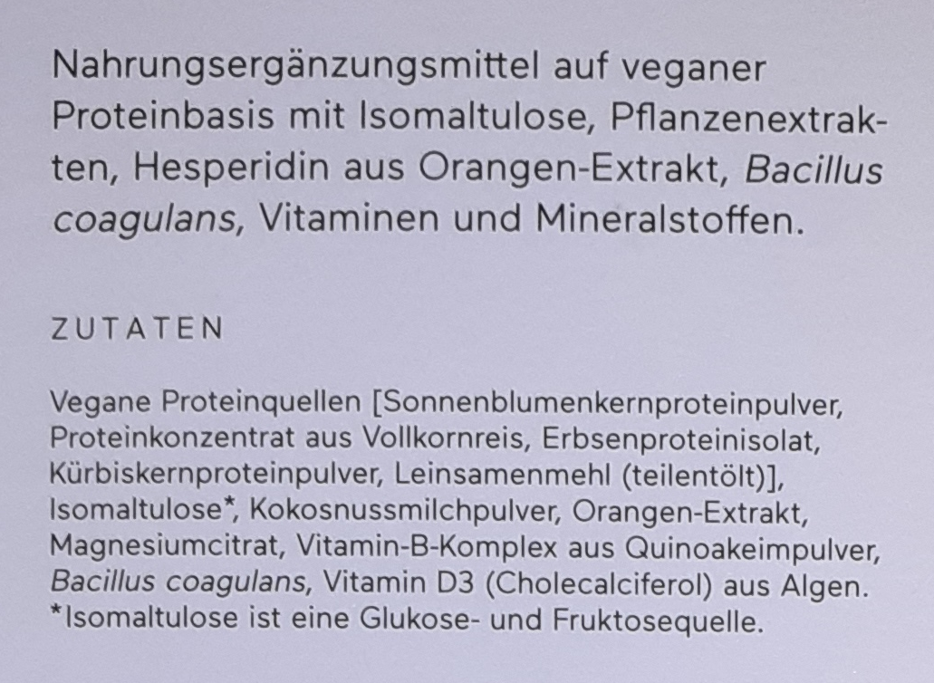 Nahrungsergänzungsmittel auf veganer Proteinbasis mit Isomaltulose, Pflanzenextrakten, Hesperidin aus Orangen-Extrakt, Bacillus coagulans, Vitaminen und Mineralstoffen.